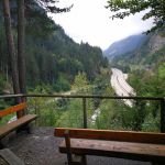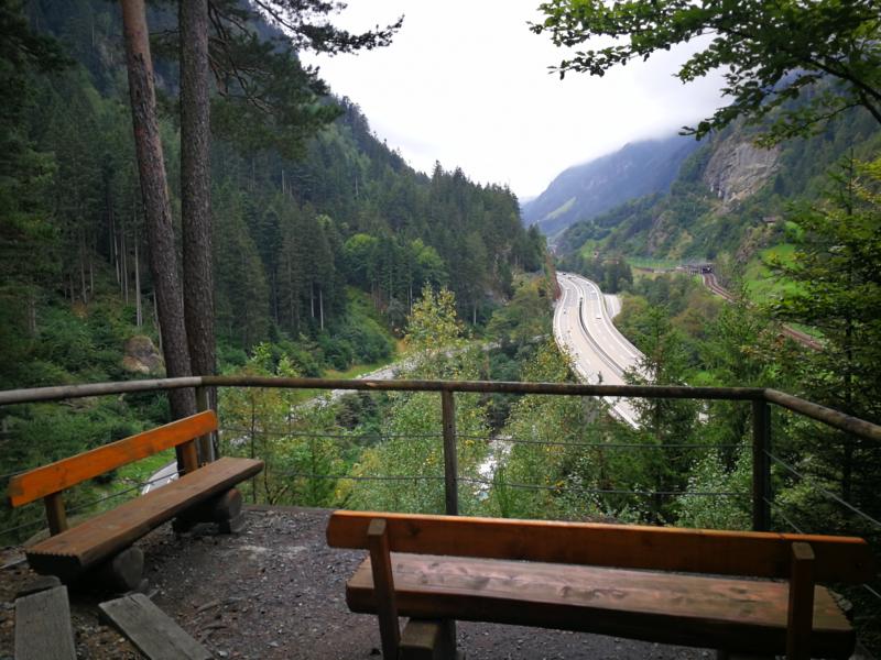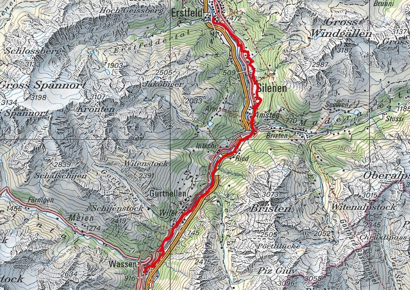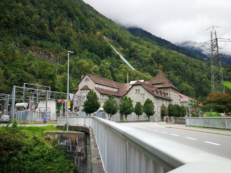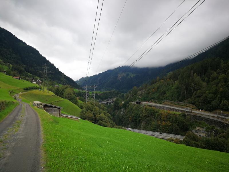 Amsteg ist erreicht, ab hier beginnt die eigentliche Steigung über den Gotthard.[4-5] Nach Amsteg verläuft die Route auf der linken Seite des Tales. Es gilt ein erstes steileres Stück zu überwinden bis etwas an Höhe gewonnen ist.[6] Nun bekommt man einen Blick auf die vielen Bauten die in dieses Tal hinein gebaut wurden.