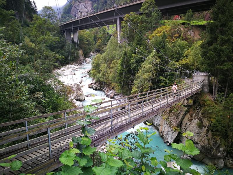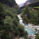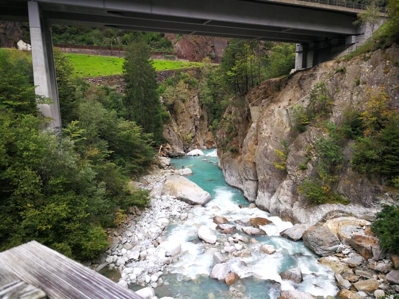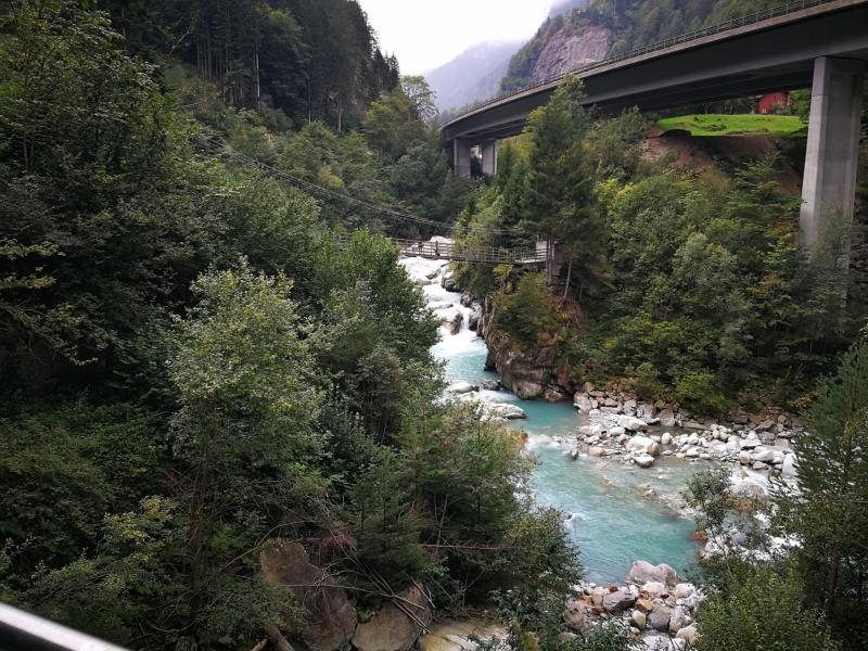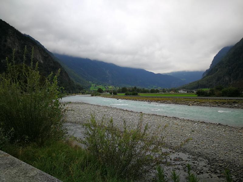 In Erstfeld am Bahnhof geht der Weg Richtung Reuss. [1] Ein gutes Stück ist sie mein Begleiter, bis Buchholz, ab da geht die Route oberhalb dem Reusstal bis Amsteg.[2]