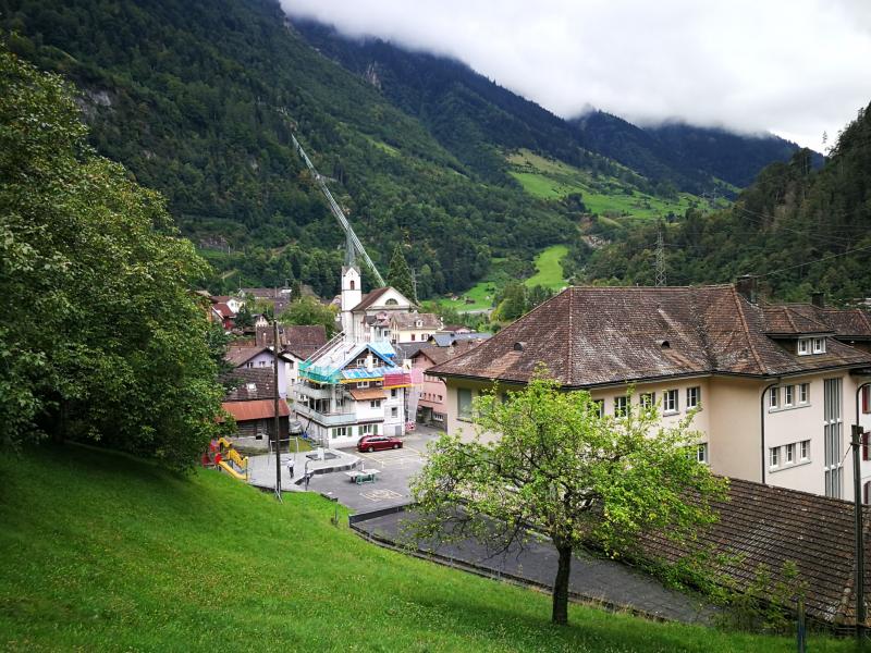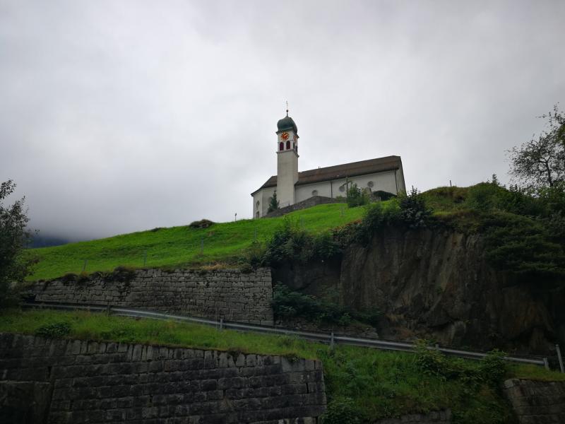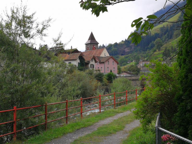 Auch ich überquere die Reuss und gelange so nach Gurtnellen.[11] Weit ist es nicht mehr bis ich die Kirche von Wassen vor mir sehe. Noch im Hintergrund, aber schon ganz nah.[12] Nach dem Stausee muss ich nur noch einen kurzen Aufstieg überwinden und schon bin ich vor der Kirche. Mein heutiges Ziel Wassen ist erreicht.[13]