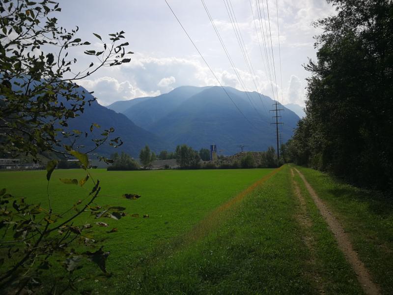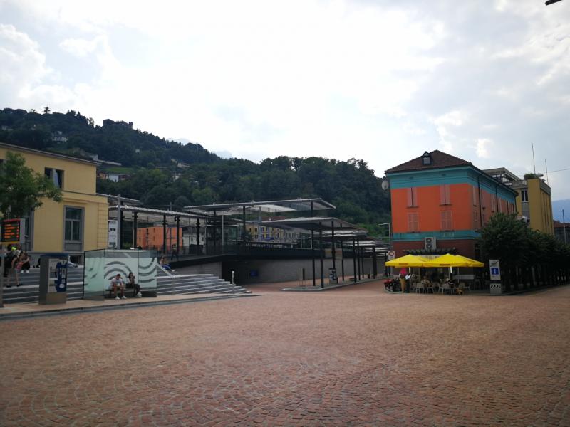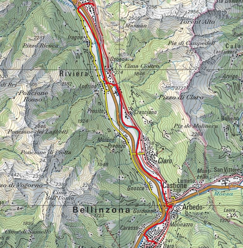Der Fluss Moesa wird überquert, welche in den Ticino endet.[10] Er entspringt im Gebiet des San Bernardino. Nun ist es nicht mehr weit, bis ich die Festung von Bellinzona erblicke. Vom Ticino geht es nun weg Richtung Zentrum und Bahnhof. Dort ist auch mein Tagesziel.[11]